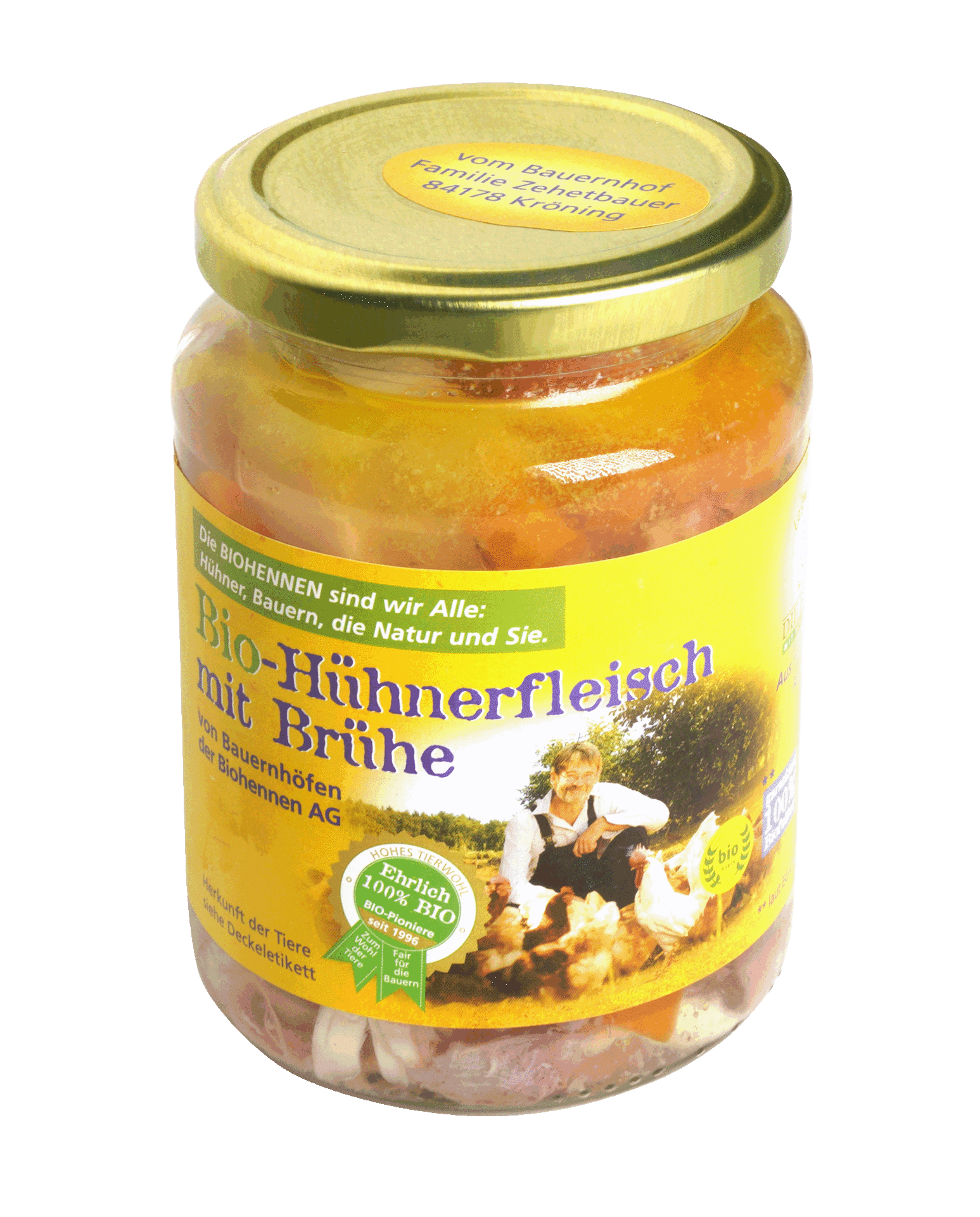 Eine vergleichbare, schnell zubereitete Alternative zur frischgekochten Suppe bieten wir mit unserer Biohennen-Hühnersuppe im Glas an: Saftige und zarte Hühnerfleischstücke mit Bio-Möhren, handeingelegt in einer nahrhaften, kräftigen Hühnerbrühe ohne künstliche Zusätze. Diese können Sie unter "Die Produkte" online bestellen und bis zu einem Jahr aufbewahren.